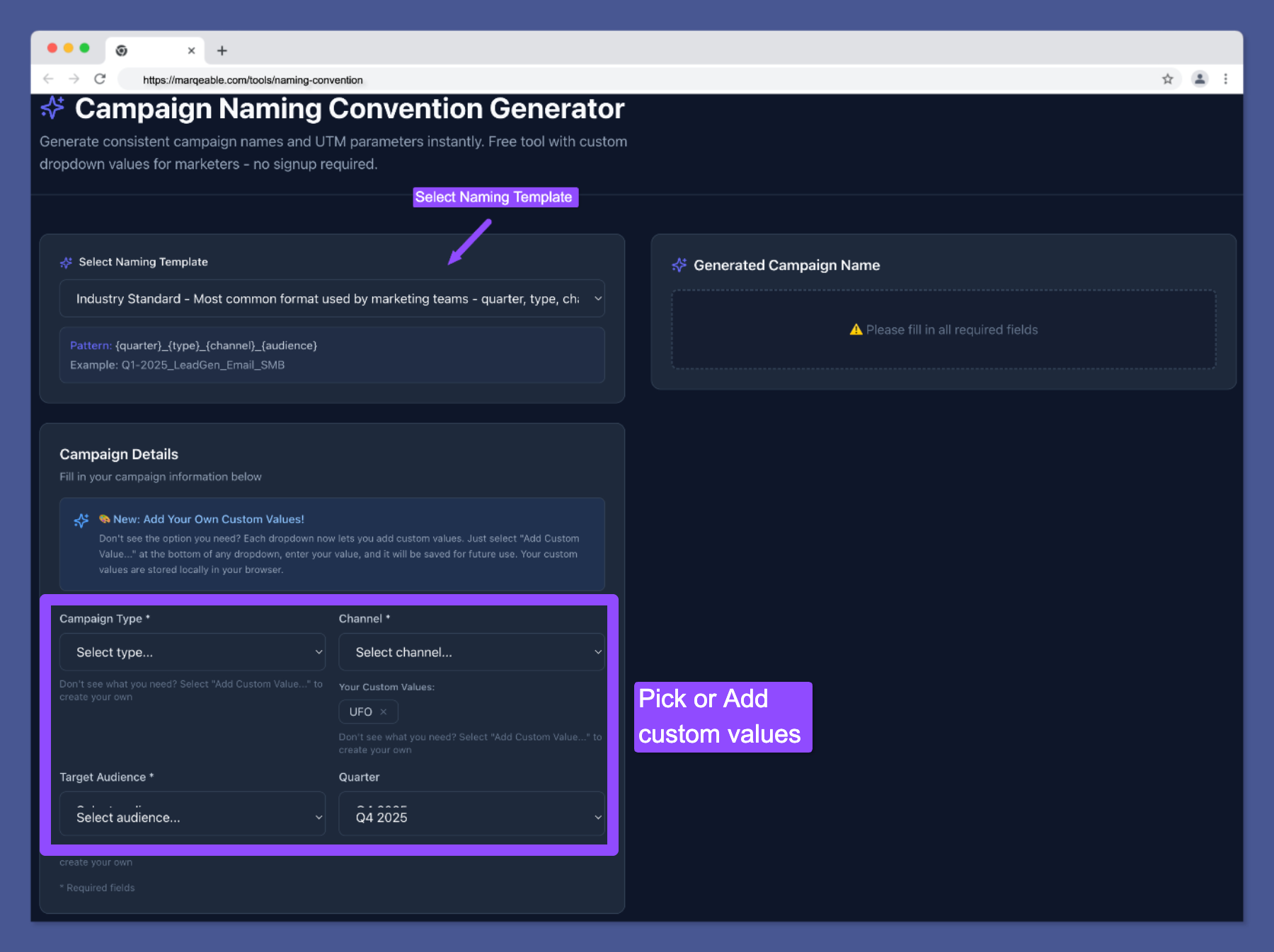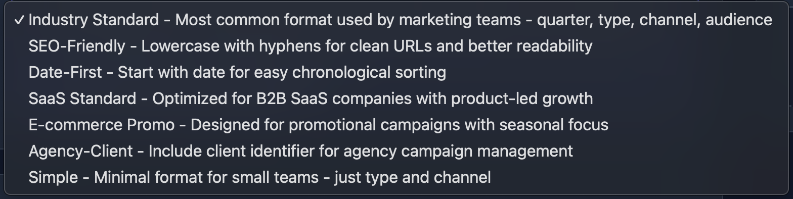 Our free Campaign Naming Convention Generator provides 7 pre-built templates for different campaign types, making it easy to create consistent names across your entire marketing organization: