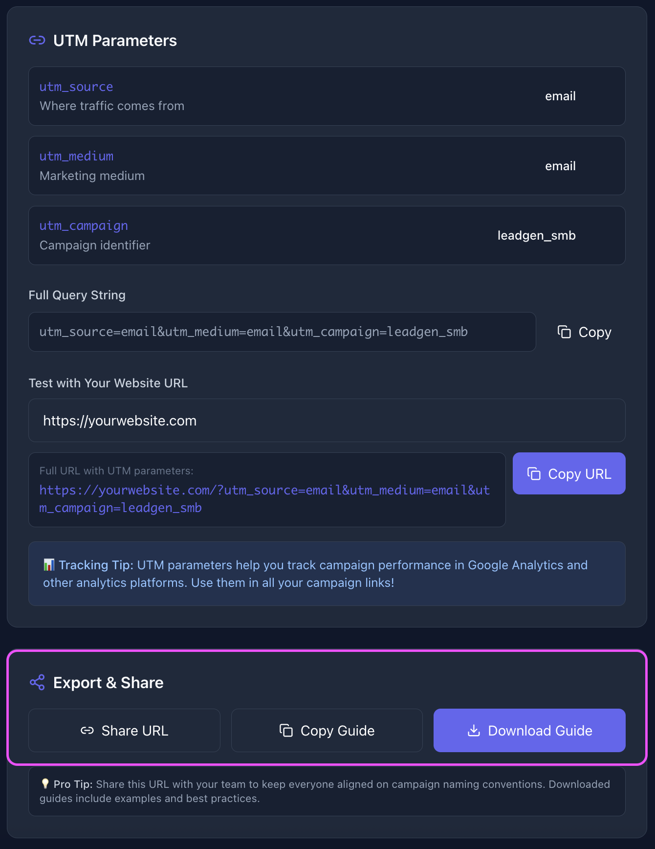 One click to copy the campaign name and UTM parameters to your clipboard. Paste into your marketing platform and launch.